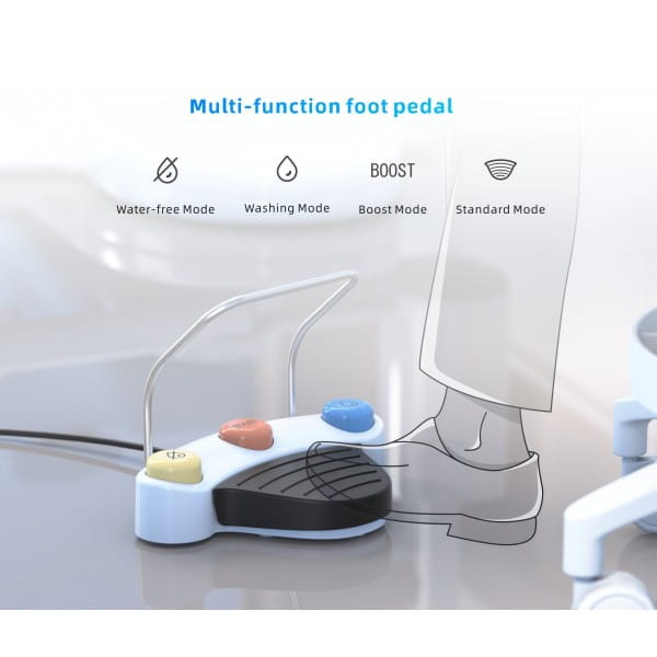 Wielofunkcyjny sterownik nożny z trybem „BOOST” pozwala na intuicyjne sterowanie urządzeniem, zwiększając efektywność pracy. Dodatkowo, możliwość podgrzewania wody oraz użycia specjalnych roztworów chemicznych, takich jak nadtlenek wodoru czy chlorheksydyna, rozszerza zakres zastosowań urządzenia.
