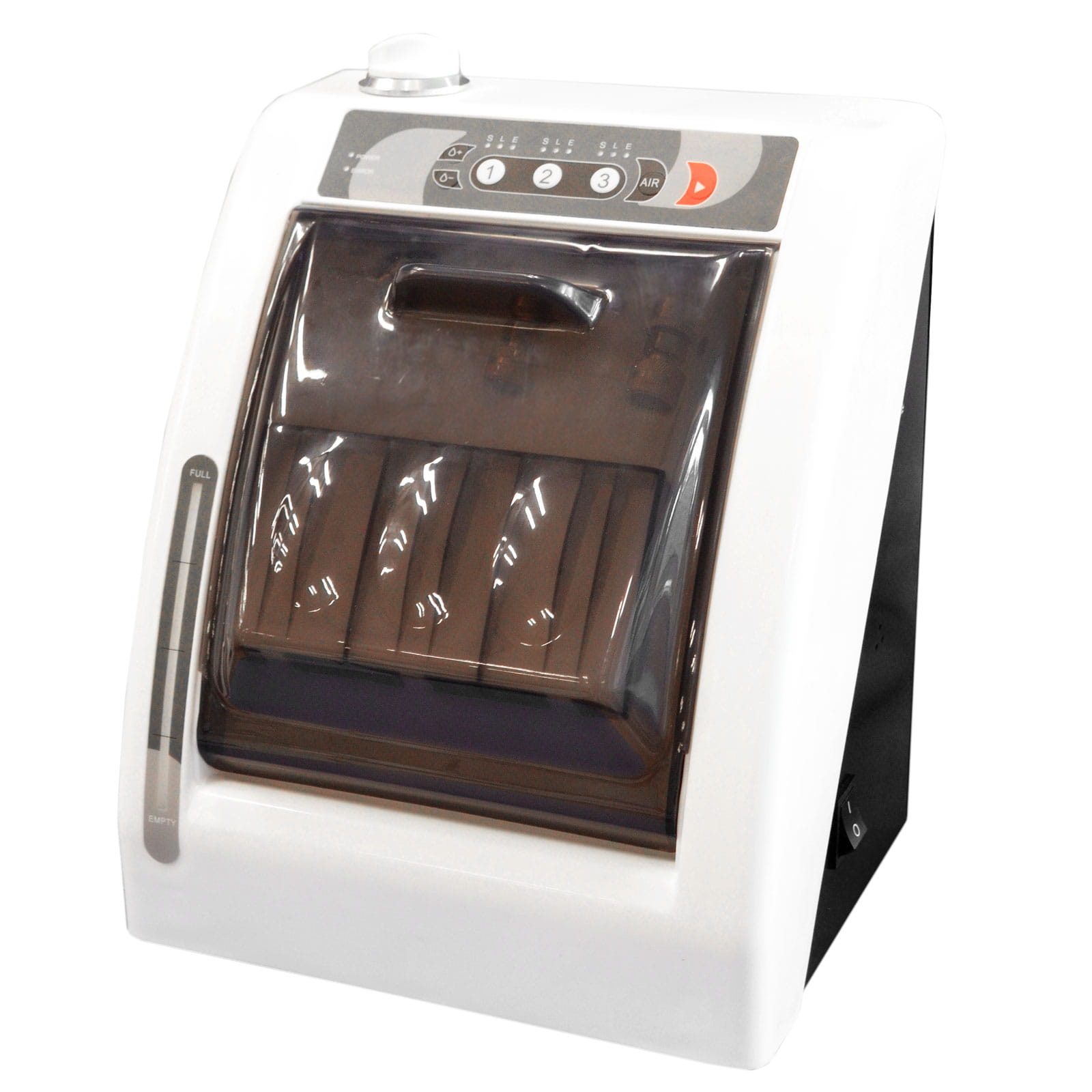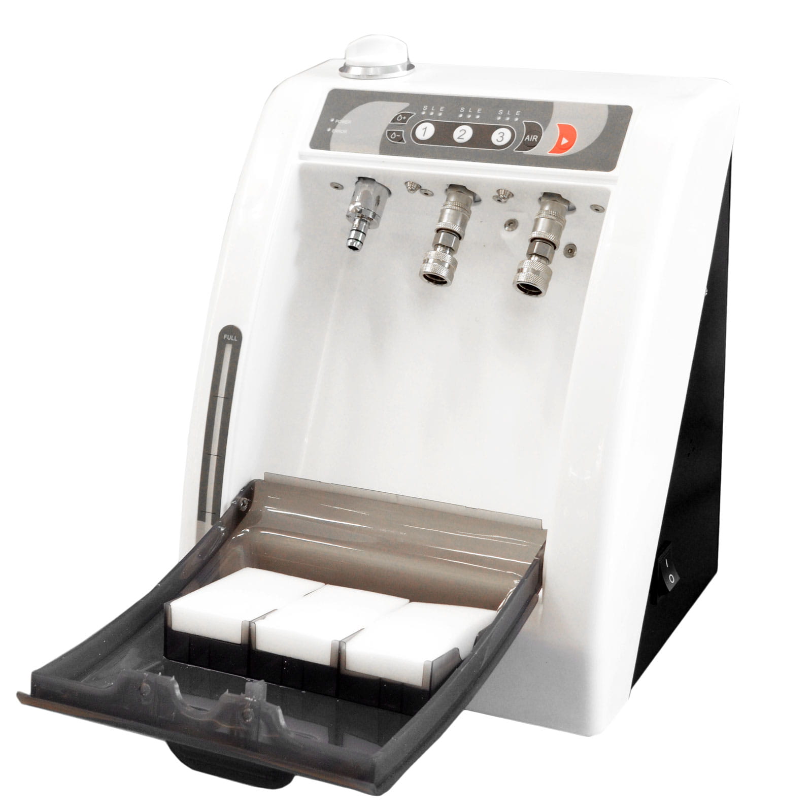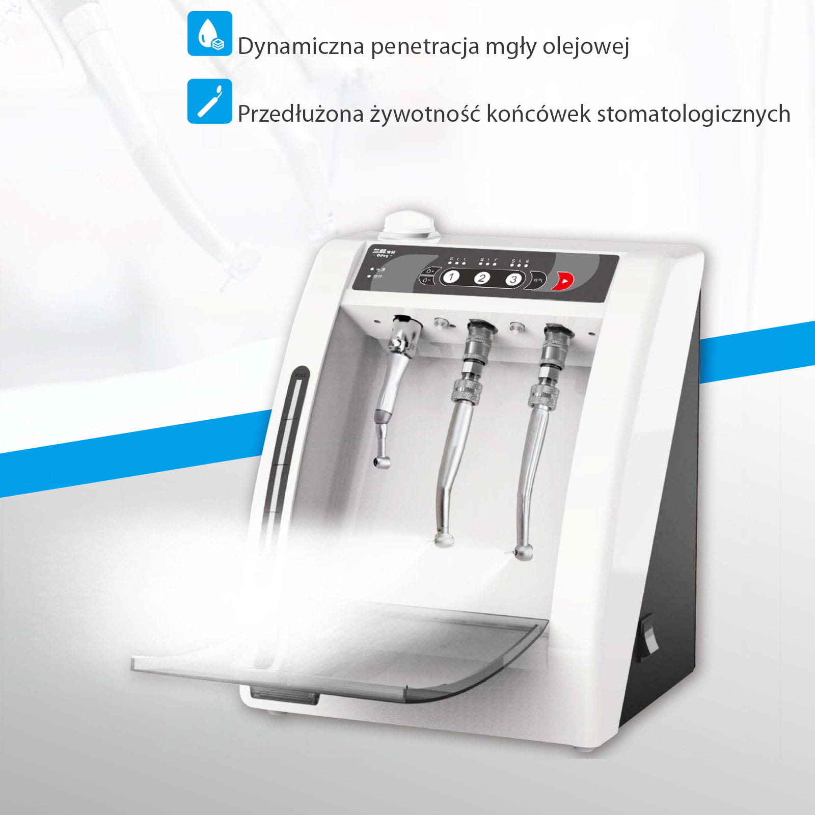 Urządzenie do oliwienia końcówek stomatologicznych – prostnic i kątnic. Oliwiarka smaruje i czyści jednocześnie 3 końcówki