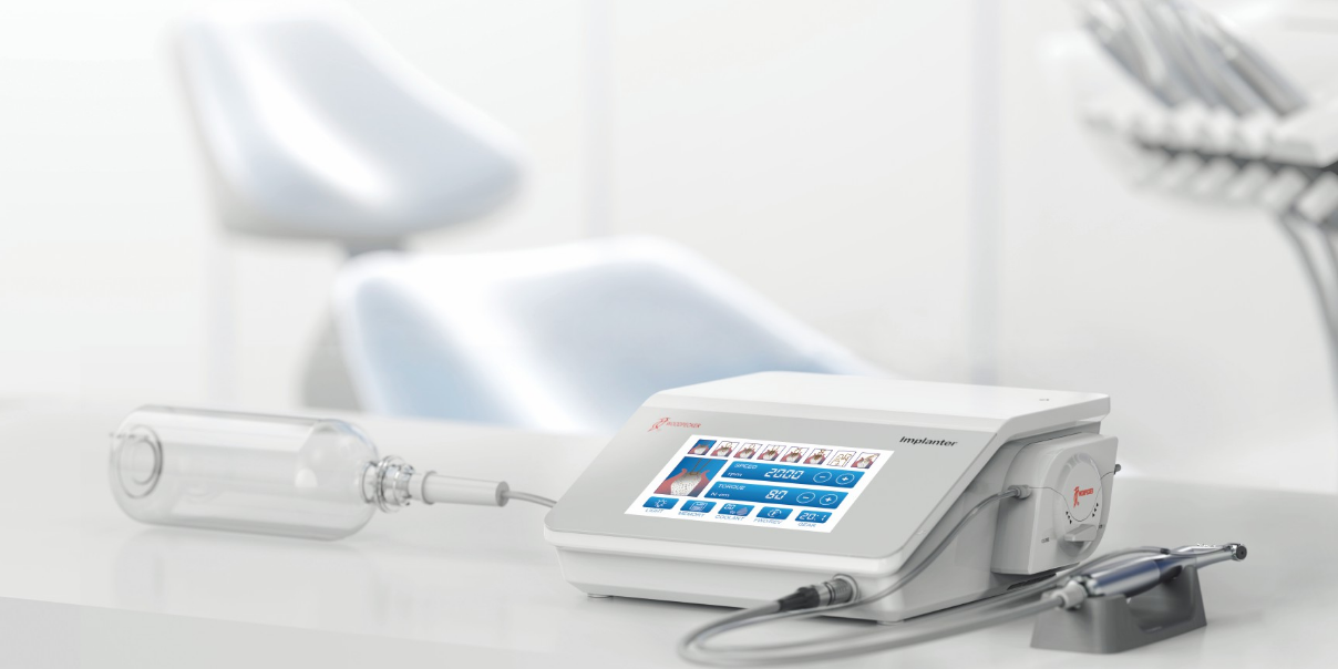 Unit chirurgiczny Implanter wyposażony w mikrosilnik, umożliwiający przygotowanie pacjenta do wkręcenia implantu. Duży, czytelny ekran dotykowy ułatwia obsługę sprzętu i daje idealną wizualizację wstępnie ustawionych wartości.