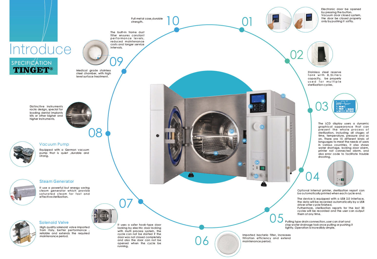 System zwielokrotnionej ochrony (mechanicznej i elektronicznej) zapewnia maksymalną ochronę dla użytkownika i urządzenia. Zastosowanie niemieckiej pompy próżniowej Thomas umożliwia efektywną a zarazem cichą pracę autoklawu.